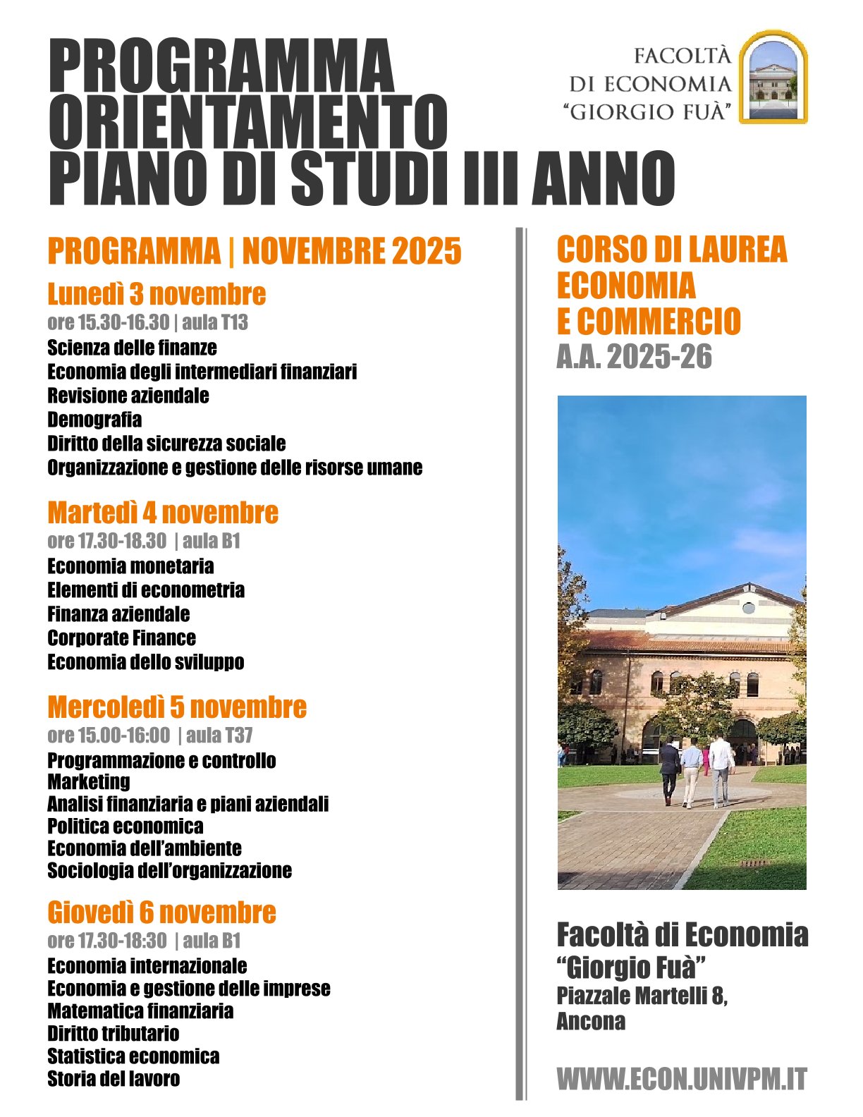 ORIENTAMENTO PIANO DI STUDI III ANNO > DAL 3 AL 6 NOVEMBRE 2025 Ancona - 3 NOVEMBRE Aula T13 | ore 15:30