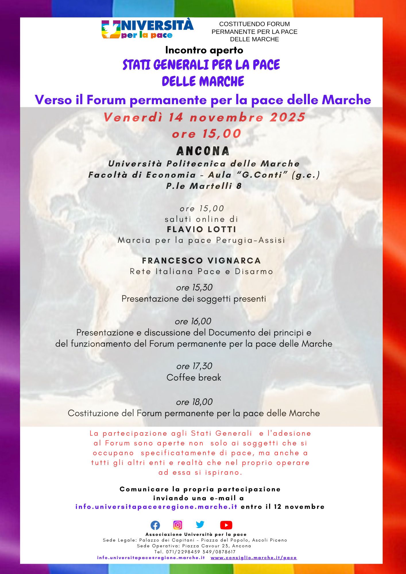 STATI GENERALI PER LA PACE DELLE MARCHE: Verso il Forum permanente per la pace delle Marche > 14 NOVEMBRE 2025 Ancona - Aula "G. Conti" | ore 15:00