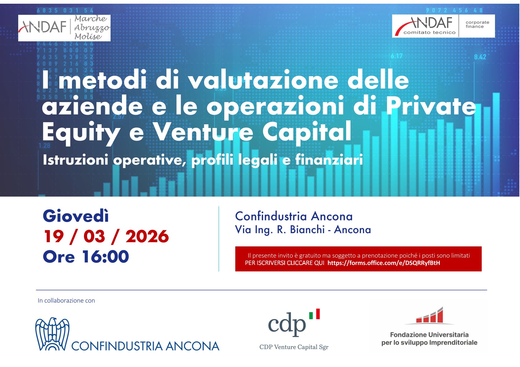 CONVEGNO I METODI DI VALUTAZIONE DELLE AZIENDE E LE OPERAZIONI DI PRIVATE EQUITY E VENTURE CAPITAL. ISTRUZIONI OPERATIVE, PROFILI LEGALI E FINANZIARI > 19 MARZO 2026